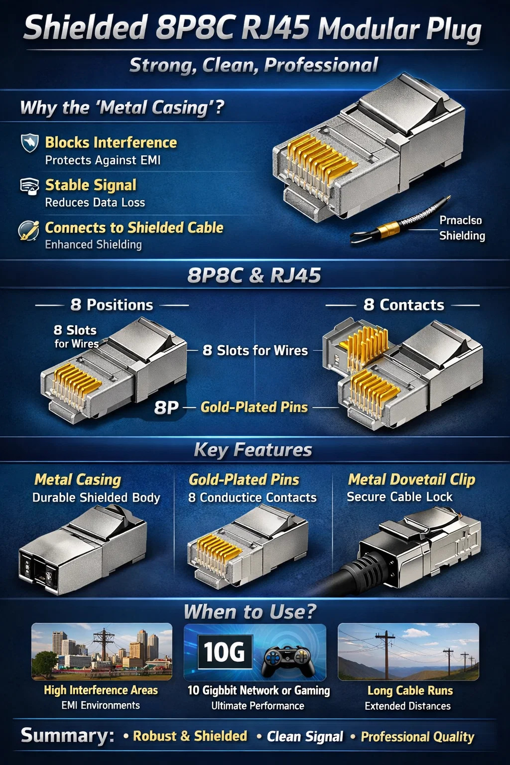 Ceci fiche modulaire blindée 8P8C RJ45 est communément appelé « tête de cristal blindée » ou « connecteur de câble réseau à boîtier métallique ». Par rapport au type transparent ordinaire, sa plus grande différence réside dans le « boîtier métallique » brillant qui l’entoure.