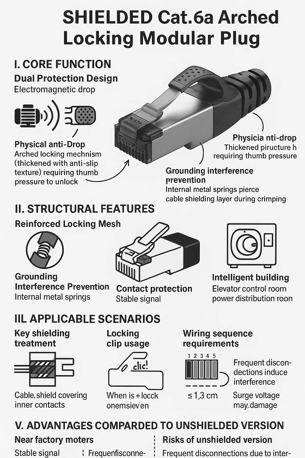 Prévention des interférences de mise à la terre : la fiche contient des ressorts métalliques internes qui percent automatiquement la couche de blindage du câble lors du sertissage, détournant ainsi les interférences vers la terre de l'équipement (par exemple, le boîtier de l'interrupteur).