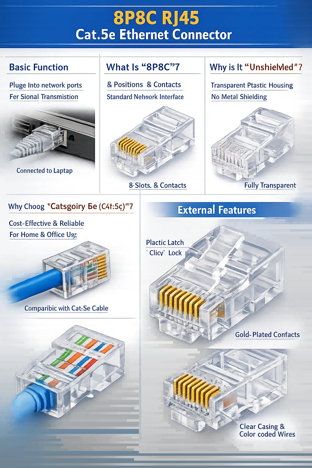 Ceci fiche modulaire non blindée 8P8C Cat.5e est en fait le type de « connecteur RJ45 » le plus courant que l’on trouve dans de nombreux réseaux haut débit domestiques, tant dans le passé qu’aujourd’hui. Il est transparent, compact et constitue un composant fondamental pour la connexion à un réseau.